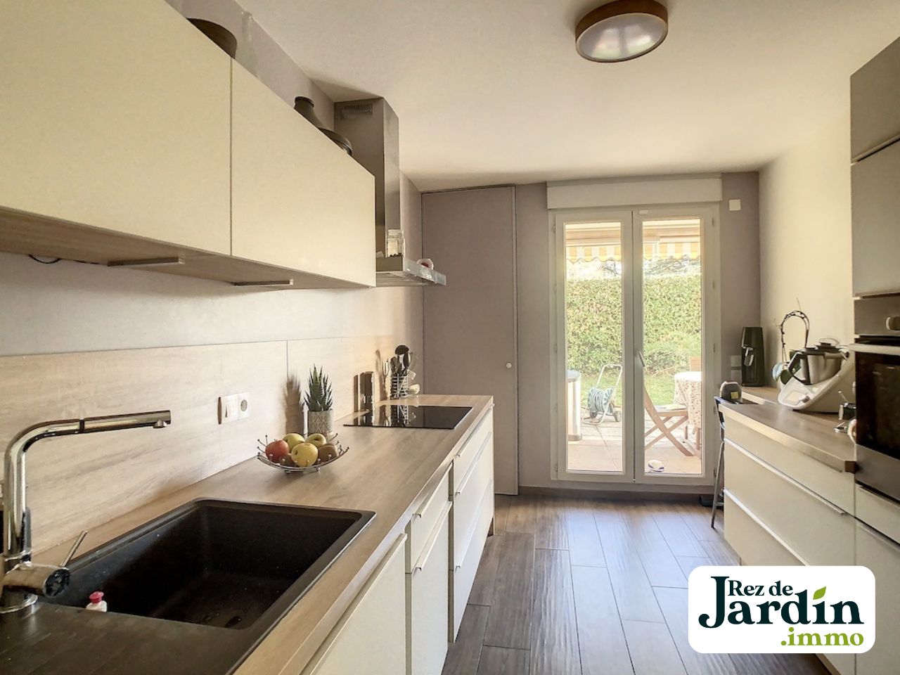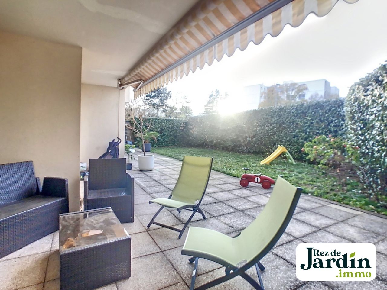 Sainte-Foy les Lyon - Quartier Chavril, dans une résidence de très bon standing à proximité du parc du Brulet et du Tennis Club de Chavri. Un très bel appartement T4 familial de 101 m2 (Carrez) en rez-de-jardin. Il comporte 3 chambre et 2 salles de bain. Toutes les chambres, le séjour et la cuisine donnent, au travers de grandes baies vitrées, sur le jardin spacieux de 120 m2 comportant une belle terrasse de 50 m2 avec différents espaces de vieL’appartement dispose d’une cave et de places de parking extérieurs (non privatives). Possibilité d’acquérir un double box en enfilade dans un garage sous la résidence. Copropriété de 25 lots. Procédure en cours : Non. Honoraires à la charge du vendeur.Pour visiter ou connaître la valeur de votre bien, contactez rezdejardin.immo : 04 72 23 04 72